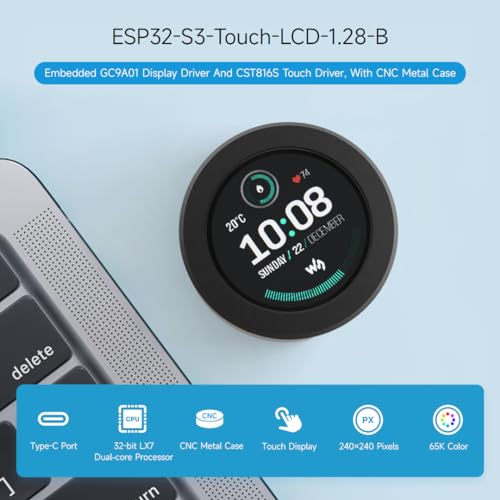 Waveshare ESP32-S3 Development Board, with 1.28inch Round Touch LCD, Compact Size, Accelerometer and Gyroscope Sensor, Embedded GC9A01 Display Driver and CST816S Touch Driver, with CNC Metal Case