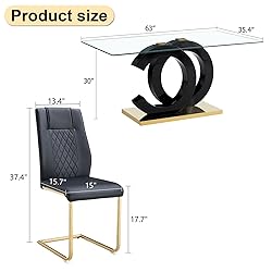 Glass Gold Dining Table Set for 4: Experience the perfect blend of modern sophistication and timeless comfort with our exquisite dining table set. Crafted with precision and style, this glass dining table set is designed to elevate your dining space to new heights of elegance and charm High-Quality Glass Dining Table: Our rectangular glass dining table boasts a sleek 63-inch tempered glass tabletop, ensuring durability and easy maintenance. Paired with sturdy MDF board and a stable base, this dining table set offers both style and reliability for everyday use Luxurious Comfort PU Leather Dining Chairs: Indulge in luxurious comfort with our faux leather dining chairs, featuring ergonomically curved high backrests and soft cushioned seats. The golden metal legs not only provide stability but also add a touch of modern flair to your dining area Complete Dining Experience: This 5-piece dining table chairs set includes one spacious glass dining table and four elegant PU leather dining chairs, offering ample seating for family gatherings or dinner parties. With its generous dimensions and high weight capacity, it's perfect for any occasion Effortless Assembly and Maintenance: With easy-to-follow assembly instructions and tools included, setting up your dining table set is a breeze. Plus, the glossy glass tabletop and high-quality chairs are a cinch to clean with just a damp cloth, ensuring hassle-free maintenance for years to come