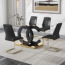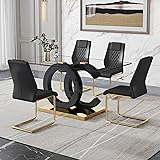 Ebullient Glass Dining Table Set for 4 ,5 Piece Dining Table and Chairs Set,Glass Table Top and Gold MDF Base,Modern Rectangular Dining Room Table with 4 Black PU Leather Upholstered Dining Chairs
