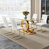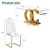 【Elegant Dining Table Set for 4】Experience the perfect blend of modern sophistication and timeless comfort with our exquisite dining table set. Crafted with precision and style, this glass dining table set is designed to elevate your dining space to new heights of elegance and charm. 【High-Quality Glass Dining Table】Our rectangular glass dining table boasts a sleek 63-inch tempered glass tabletop, ensuring durability and easy maintenance. Paired with sturdy MDF board and a stable base, this dining table set offers both style and reliability for everyday use. 【Luxurious Comfort PU Leather Dining Chairs】Indulge in luxurious comfort with our faux leather dining chairs, featuring ergonomically curved high backrests and soft cushioned seats. The golden metal legs not only provide stability but also add a touch of modern flair to your dining area. 【Complete Dining Experience】This 5-piece dining table chairs set includes one spacious glass dining table and four elegant PU leather dining chairs, offering ample seating for family gatherings or dinner parties. With its generous dimensions and high weight capacity, it's perfect for any occasion. 【Effortless Assembly and Maintenance】With easy-to-follow assembly instructions and tools included, setting up your dining table set is a breeze. Plus, the glossy glass tabletop and high-quality chairs are a cinch to clean with just a damp cloth, ensuring hassle-free maintenance for years to come.