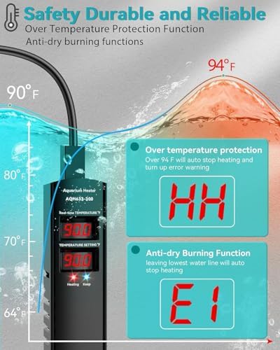 - 🐟🌡️[Upgrade Intelligent Safety Protection] 🐟Protection against overheating, Over-temperature, and lack of water protection, Anti-dry burning functions. Safeguard your fish and aquarium with advanced safety measures. When the water temperature exceeds 94℉, the LCD digital display will display HH and keep flashing to remind. When the digit heater detects the fish tank's lack of water, it will auto-shut off