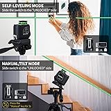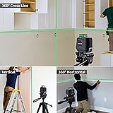 【High Visibility and Accuracy】: This self leveling laser level projects green laser beams which is 4X brighter than standard red beams. This gives the laser tool 100 ft. visible range with with accuracy of +/- 1/17 in. at 23 ft. Applicable for floor and wall tiling, drop ceiling installation, door/window calibration, cabinet installation, home decoration. Safety Class II laser product, <1mW power output. 【Multiple Working Modes】: Unlock the pendulum, the laser level will self-level within 4°(otherwise the laser will keep flashing). Lock the pendulum to switch to the manual mode, meet your alignment needs from different angles. Brightness Adjustment mode, three brightness levels of visibility adjustment function enables users to select the line brightness in different light conditions. 【Bonus 60 Inch Compact Tripod】: The included laser tripod can expand to 60 inch helps you adjust the position of the laser for maximum accuracy. It closed height of 19.2 inch, ease of storage. Combined with a standard 1/4" quick release plate, you can install and remove the laser level in seconds. Notice: You need to push quick release plate knob hard before rotating and fixing it to the laser level! 【Versatile Layout】: The laser tool produces vertical line, 360° horizontal line and cross-line modes, for a broad array of alignment and leveling applications. It projects self leveling vertical and horizontal laser line simultaneously to create a cross-line while surveying, guiding, leveling and more. 【Compact & Durable Design】: This is a compact and lightweight easy-to-carry laser tool constructed with rugged body for easy gripping, provides IP54 water and dust resistance. The included strong magnetic L shape bracket allows for attachment to metal surfaces and turn the laser level around at 360 degree. The 1/4"-20 threads on the bottom of the tool for convenient positioning.
