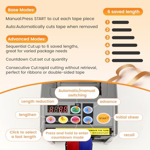 - INTELLIGENT MEMORY AND CONVENIENT SETTINGS: The automatic tape dispenser cutter features smart storage and memory functions, allowing users to save six different length settings for repeated use, ensuring quick and accurate reproduction of the required tape length in multiple operations to increase work efficiency