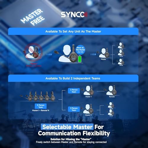 - Ready Out of The Box, Fast Auto-connect: SYNCO Xtalk X5 wireless intercom system comes pre-paired as a set and is ready to use upon arrival without complicated pairing(If you need to reset the unit as the master, pls follow the user manual to setup). SYNCO Xtalk has a variety of convenient functions, such as you can rotate the boom arm up/down to mute/unmute. Press and hold the B button to enter domination mode which the master is available for speaking and muting all remotes. it's the ultimate solution for efficient teamwork in filmmaking, live broadcasting, corporate events, and stage performances.