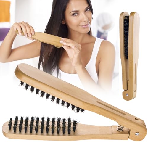 Double Sided Bristle Hair Brush, Clamp Hair Brush Use for Smoothing and Straight Hair Styles, Wooden Hair Straightening Brush