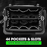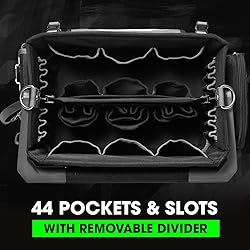 EASY-ACCESS PIVOTING HANDLE - For heavy-duty use and easy access on the job 1680D HIGH-DENSITY BALLISTIC POLYESTER - Ultra-durable material resists wear and tear on the job for long-lasting life 44 POCKETS AND SLOTS - For custom organization QUICK-CONNECT LATCHES - Fast and effortless interlocking connectivity allows you to quickly stack and unstack toolboxes and accessories REMOVABLE DIVIDER - Organize a variety of hardware or supplies to customize your configuration PADDED SHOULDER STRAP INCLUDED - For comfortable transport ACCESSORIES INCLUDED - Includes level strap, tape measure clip, and tape strap holder for easy mounting FULL RANGE COMPATIBILITY - STACK PACK toolboxes, organizers, accessory cases, and toolbox attachments are endlessly configurable across the full STACK PACK system ONE-YEAR WARRANTY - Register your new products and get a one-year limited warranty on your FLEX STACK PACK toolboxes and organizers