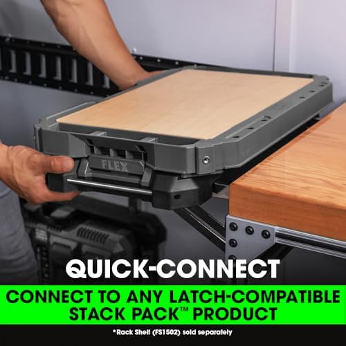 Turn your STACK PACK™ setup into a mobile work surface with the FLEX STACK PACK™ Worktop. The worktop features a ¾-inch renewable plywood top that is durable and easily transportable, ready to take on the jobsite. Quick-connect latches offer fast and effortless interlocking connectivity with STACK PACK™ toolboxes and the Folding Rack Shelf (FS1502) for a customized work surface setup. The worktop features recessed storage bins and onboard hand tool racks integrated into its design for easy access to bits, screws, fasteners, and hand tools when you’re on the job. It’s also compatible with STACK PACK™ attachments and accessories to further customize your setup. A folding storage hook provides secure storage and easy transport when hung from STACK PACK™ rack rails. It’s protected by a one-year limited warranty when registered within 30 days of purchase at registermyflex.com.
