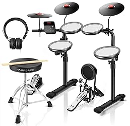 - 【Perfect for Beginners】The HAMPBACK MK-0 PRO electric drum set features 4x7" quiet double-layer high-density mesh drum pads, 3x8" full rubber-covered cymbals, and a 5" bass drum. It includes a drum throne, drumsticks, headphones, and all necessary equipment for beginners and kids, providing your first electric drum kit in your life. 【Ideal for Outdoor and Apartment】HAMPBACK specially developed ultra-small rack for MK-0 PRO makes it very easy to put it in the car trunk to take out for outdoor impromptu performances with friends on weekends. At the same time, benefit from our foldable rack design, after practice, the electronic drum set can be placed under the bed or against the wall, saving a lot of space for apartment. 【Power Bank Power Supply】 Now, put all your worries aside, as long as you have a power bank, you can play our electronic drum set anytime, anywhere. The MK-0 PRO sound module features 68 sounds, 12 kits and 10 songs, can provide you enough joy of playing. 【Ultra-Durable Bass Drum】 Most bass drum heads are easily damaged after being used for a period of time. Our engineers used a special material after extensive research, and it has been tested for more than 22 million+ consecutive hits and is still intact. The 5'' small size bass drum design minimizes the noise caused by hits. 【Immersive Percussive Feedback】HAMPBACK is committed to providing players a nice electronic drum set with amazing percussve feedback. When you hit the cymbals, you can feel the feedback with softness rather than harshness. Hit our drum pads and you’ll get the same feeling as acoustic drums. When you step on our bass drum, your foot will feel the slow force released by the pedal instead of instant pressure. 【Buy with Confidence】All HAMPBACK electronic drum kits come with a 2-year warranty, If you encounter any issues or are unsatisfied with your purchase, please contact us at any time, we will provide satisfactory after-sales service!