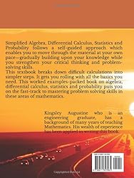 - Simplified Algebra, Differential Calculus, Statistics and Probability serves as a useful companion for students in high schools, colleges and universities. This book consists of step-by-step explanation of topics presented in a way that is easy for students to understand. It contains very many worked examples and many self-assessment exercises to ensure that students get a mastery of each topic covered. The answers to the exercises are provided at the end of the book. What makes this book a unique mathematical asset, is its detailed step by step approach in explaining the topics covered in these branch of mathematics. Instead of solving questions by going straight to the point, leaving you confused and frustrated, this textbook teaches you in simple English, explaining each step taken at a time. Thus, allowing anyone, regardless of their experience in algebra, differential calculus, statistics and probability to understand each topic with ease, and hence make mathematics more interesting. Exercises are given at the end of each chapter for students to assess their understanding of the topics. Answers to the exercises are provided at the end of the book. This math textbook is an ideal resource for high school (secondary school), college and university students. It is also a useful book for students preparing for admission into tertiary institutions and need to take entrance tests or exams. Topics covered in this math textbook include:BASIC ARITHMETIC OPERATIONSSIMPLIFICATION, FACTORIZATION AND SUBSTITUTION IN ALGEBRALAWS OF INDICESLINEAR EQUATIONS AND CHANGE OF SUBJECT OF FORMULAELINEAR EQUATIONS FROM WORD PROBLEMSSIMULTANEOUS LINEAR EQUATIONSWORD PROBLEMS LEADING TO SIMULTAENOUS LINEAR EQUATIONSQUADRATIC EQUATIONWORD PROBLEMS LEADING TO QUADRATIC EQUATIONSVARIATIONSIMULTANEOUS LINEAR AND QUADRATIC EQUATIONSLINEAR INEQUALITYQUADRATIC INEQUALITYINTRODUCTORY VECTOR ALGEBRASIMPLIFICATION OF ALGEBRAIC FRACTIONSEQUATIONS AND SUBSTITUTIONS INVOLVING FRACTIONSSIMULTANEOUS EQUATIONS INVOLVING FRACTIONSABSOLUTE VALUE EQUATION (MODULUS EQUATION)INEQUALITIES INVOLVING ABSOLUTE VALUES, QUOTIENT AND SQUARE FUNCTIONSINDICIAL EQUATIONSROOTS OF QUADRATIC EQUATIONS (USE OF ALPHA AND BETA)FUNCTIONSPOLYNOMIALSPARTIAL FRACTIONRADICAL EQUATIONSLIMIT OF A FUNCTIONDIFFERENTIATION FROM FIRST PRINCIPLEGENERAL RULE OF DIFFERENTIATION AND COMPOSITE FUNCTIONSPRODUCT RULE OF DERIVATIVEQUOTIENT RULE OF DERIVATIVEDERIVATIVE OF PARAMETRIC EQUATIONSDERIVATIVE OF IMPLICIT FUNCTIONSDERIVATIVE OF TRIGONOMETRIC FUNCTIONSDERIVATIVE OF INVERSE FUNCTIONSDERIVATIVES OF INVERSE TRIGONOMETRIC FUNCTIONSDERIVATIVES OF HYPERBOLIC FUNCTIONSDERIVATIVE OF LOGARITHMIC FUNCTIONSDERIVATIVE OF EXPONENTIAL FUNCTIONSLOGARITHMIC DIFFERENTIATIONDERIVATIVE OF ONE FUNCTION WITH RESPECT TO ANOTHERHIGHER DERIVATIVES (SUCCESSIVE DIFFERENTIATION)MISCELLANEOUS PROBLEMS ON DIFFERENTIAL CALCULUSCOLLECTION AND TABULATION OF DATAMEAN, MEDIAN AND MODE OF UNGROUPED DATACOLLECTION AND TABULATION OF GROUPED DATAMEAN, MEDIAN AND MODE OF GROUPED DATAMEAN DEVIATIONVARIANCE AND STANDARD DEVIATIONQUARTILES AND PERCENTILES BY INTERPOLATION METHODBASIC THEORY OF PROBABILITYPROBABILITY ON SIMPLE EVENTSPROBABILITY ON PACK OF PLAYING CARDSPROBABILITY ON TOSSING OF COINSPROBABILITY ON THROWING OF DICEMISCELLANEOUS PROBLEMS ON PROBABILITY