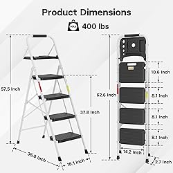 SUPPORTS UP TO 400LBS FOR SUPERIOR STABILITY – Built with high-grade steel, the BONTEC 4-Step Ladder offers an impressive 400lbs load capacity, ensuring stability and security for all your heavy-duty tasks, both indoor and outdoor. TOOL TRAY AND SPACE-SAVING DESIGN – The tool tray provides convenient storage for your tools, paint buckets, and other essentials, reducing the need to climb up and down. It folds to just 2.7 inches thick, making it perfect for compact storage and easy transport. SAFETY-FOCUSED NON-SLIP DESIGN – The wide anti-slip pedals and non-slip rubber offer excellent foot support, while the handrail, wrapped in soft sponge, provides a comfortable and secure grip. The rubber feet ensure the ladder stays firmly in place and prevents floor scratches. COMPACT, LIGHTWEIGHT & PORTABLE – This lightweight ladder weighs just 18.7 lbs and folds down to a space-saving 2.7 inches thick, making it easy to carry and store. Whether at home or on the job, it’s a versatile and portable solution for reaching heights. EASY ASSEMBLY AND SPACE-SAVING – The ladder comes with the main structure and steps pre-assembled, ready for immediate use. The tool tray is easy to install without the need for tools. When folded, it’s only 2.75 inches thick, making it perfect for storage in tight spaces.