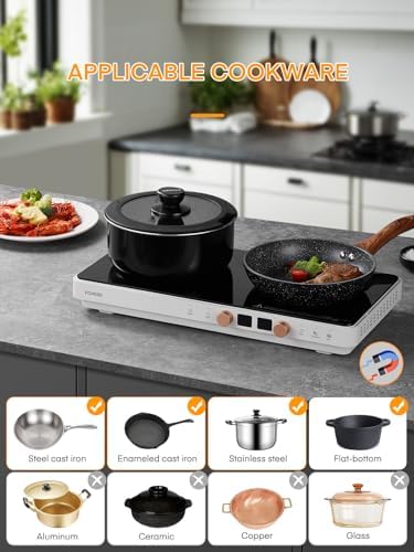 - 【2 in 1 Function】: Induction cooktop 2 burners with removable cast Iron griddle pan non-stick, you can use it as a substitute for an indoor electric grill or as a double induction cooktop to cook on. Our removable griddle pan allows you to enjoy a variety of cooking options, making cooking more diverse, from exquisite pancakes to sizzling steaks.