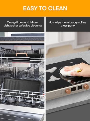 - 【Easy to Clean】: Our induction cooker has a high-quality smooth glass surface that can be easily cleaned with a damp cloth. The smooth surface of the all-cast iron grill pan is covered with a non-toxic non-stick coating, which will not leave any frying residue and is dishwasher-safe.