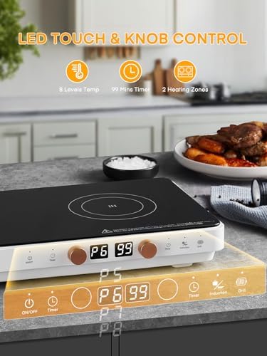 - 【Unique Design】: Our portable induction stove is designed with two independent cooking zones that you can operate simultaneously, saving you a lot of time compared to an induction stove with only one cooking zone; our Induction cooktop with 2 burners has a "knob + touch" control design for easy control operation.