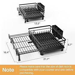 Large Capacity: Dimension: (12.2" to 21.7") Width x 16.4" Depth x 6.7" Height. Equipped with an extendable drying rack that fits over the sink, SNTD's dish drying rack features a 2-in-1 design, doubling the storage space to hold 10 plates, 12 bowls, 6 glasses, 1 pan, and silverware. Just say goodbye to cluttered countertop and enjoy a tidy and organized kitchen. Effective Drainage: With an angled drip tray and a draining spout(6.06"-8.54"), our dish drainer directs water into the sink, not onto the counter. The heightened leg attachments are specifically designed to complement sinks with lips, offering a solution where other dish racks may fall short in efficiently draining water into the sink, preventing potential leaks or water pooling on the countertop. Adjustable Extension Feet: The drying rack over sink features 2 expandable feet, easily accommodating different sinks. The built-in fence ensures secure drying of large stuff on the rack and prevents them from tipping or sliding into the sink. (Tip: Please make sure the width of your sink is less than 21.2 inches before purchasing in case of incompatibility.) Rustproof Material: Made of premium metal steel guardrail, coated wire and anti-fingerprint PP drip tray, our dish drying rack is anti-rust and can serve for a long time, while the rubber coated feet ensure it stays in place without scratching your countertop. Wide Application: Our drying rack includes a removable 3-compartment utensil holder for efficient silverware drying, a dish rack, an extension part, easily accommodating all kinds of kitchen items, keeping them in place and easy to find. SNTD's dish rack is a space-saving solution for drying essentials while keeping them organized.