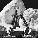 Multipurpose Tool: The multifunctional scissors come with various accessories: knife, big and small flat screwdriver, bottle opener, card removal tool, nail file, carton cutter, ear pick, tweezer and lanyard hole, highly practical for everyday use, camping, travel, or emergency, providing great convenience Stainless Steel Scissors: FLISSA multitool is made of high-quality stainless steel with excellent hardness, cutting performance, wear and corrosion resistance. Whether indoors or outdoors, the scissors stay sharp and reliable for various cutting tasks Built-in Spring & Effortless Operation: The mini multi tool also adds a built-in spring that automatically springs back after each use, making it easy to operate and achieve efficient cutting while reducing hand fatigue. This design enhances the multi-tool that can be easily used with one hand Aluminum Handles: The black oxidation treatment not only enhances appearance but also provides an extra layer of protection. The striking black finish gives the pocket multitool a sleek and modern look, making it stand out as both a useful tool and an exquisite gift for family and friends Foldable & Portable: Compact in size, the small multitool can be folded for storage, which can be easily put into pocket or bag, keeping safe when not in use. What's more, there is a lanyard hole for everyday carry, making it accessible when you're outdoors. The EDC multitool is an essential and practical accessory for outdoor enthusiasts