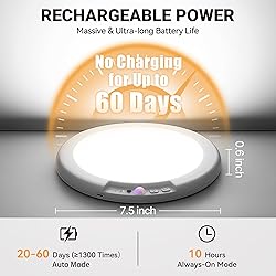 3 Modes Available Motion Sensor Light: Our wireless ceiling light fixture is equipped with 3 modes (Day/Night Motion Activated Mode, Always On Mode). 'Bulb' shape means the ceiling light works as a common ceiling lamp without motion sensing function. 'Sun' shape means the ceiling light works in Day Motion Activated Mode. 'Moon' shape means the ceiling light works in Night Motion Activated Mode. Motion sensor light will activate and keep lighting 20s in the bright/dark when motion is detected. 3 Color Temperatures & Dimmable Brightness: Choose your lighting color from Warm white, Natural white, Daylight white, and adjust brightness between 10%-100%. Easy lighting selection of the ceiling light with a push button or remote control. The ceiling light with remote has a timing function to save power consumption, illuminate your space with lower energy consumption. Rechargeable & Longer Battery Time: The battery LED ceiling light is rechargeable with massive & ultra-long battery life, The rechargeable LED ceiling light provides a stable and soft light source for up to 10-20hrs and induction over 650-1300 times on a single charge. No flicker, natural and uniform lighting sources take care of your eyes always. Wide Application: The ultra-slim battery operated ceiling light with simple and low profile design (thickness less than 1 inch). Ideal for any ceiling area to lighting up your kitchen, bathroom, bedroom, living room, hallway, toilet, stairs, closet or any other dark area that needs more brightness. Easy Installation: Easy to fit the magnetic ceiling light on the ceiling without drilling and screws. Only takes 3 seconds and 3 easy steps to complete the installation. Make it easy to put the batery operated ceiling light on and remove it from the ceiling for charging.
