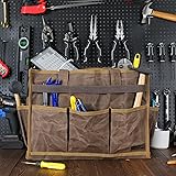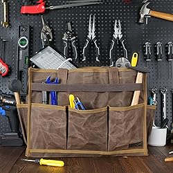 MATERIAL: 16OZ waxed cotton canvas, durable and stain-resistant DIMENSION: ( L ) 16.5" X ( W ) 7" X ( H ) 12" / ( L ) 42 X ( W ) 18 X ( H ) 30 cm COMFORTABLE: Handle with padded handle can relieve hand fatigue, which cuts down on injuries while carrying heavy tools PRODUCT DESIGN: This tool bag has 6 external pockets with Elastic Strap reinforcement for maximizing the space, 2 outside pockets,a large main compartment with 6 internal pockets. It can help you organize your tools and easily identify them, saving space and time MULTI-FUNCTION: This bag can be used as a tool bag for storing various wrenches, hammers, screwdrivers. Finishing bags, travel accessories bags, brush bags, electronics bags, wire bags, building material bags, toiletry bags, storage bags, etc. . .