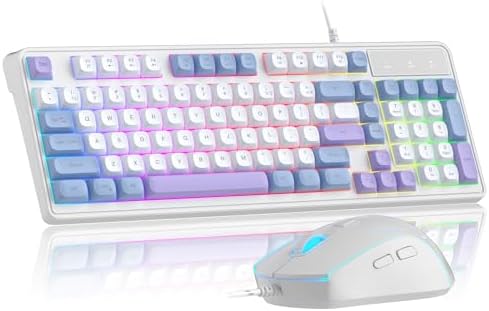Wire Gaming Keyboard,Creamy Keyboard and Mouse Combo, 7 Colorful Rainbow Backlight Classic Gaming Keyboard (White & Blue & Purple)