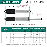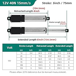 【Specification】: 12 Volt Electric Micro Stroke Linear Actuator Stroke length = 75mm(3"); Retracted length =104.5mm(4"); Extended Length= 154.5mm(6"); Travel speed =0.6 inches/sec (15 mm/s);Maximum current draw = 2.5Amps; Maximum Load = 9lbs(40N). 【Durable and Sturdy】 Made of high quality aluminum alloy material and equipped with high-performance motor; Built in limit switch, stop at any position, automatically stop at the top, with IP54 protection, short circuit protection, and reliable. 【Low Noise Design】The Linear Actuator adopt low noise motor, the noise level below 50 dB, This makes it suitable for use in hospitals, massage centers, and other noise-sensitive environments. 【Wide Application】Widely used in electric lifting systems, Intelligent Range Hood, Fan Blades, Cabinets, Window Opener, Robotics, and Home Automation. electric recliners, Ideal for medical chairs, electric equipment, camera racks, electric sofas, cameras, etc. 【Easy Install & Safe】Quick mounted by using brackets, and easy connect the actuator to your 12-volt safe power supply. Package contains 1 mini linear actuator and 2 bracket sets.