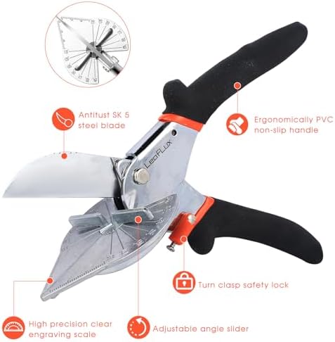 - 【Adjustable Angles for Versatile Cutting】LeafLux miter shears come with an adjustable slider for angular cutting at 45°, 60°, 75°, 90°, 120°, and 135°. Achieve perfect angles for corner joints, trim, and molding with ease, making this tool ideal for crafts and multifunctional uses.