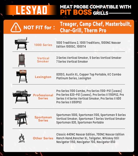 - COMPATIBILITY: Meat probe is only compatible with Pit Boss wood pellet grills and smokers. NOTE: The Pit Boss probe NOT FIT FOR Treager, Camp Chef, Masterbuilt, Char-Grill, Therm Pro. Please ensure your grill is a Pit Boss and confirm that the model is compatible