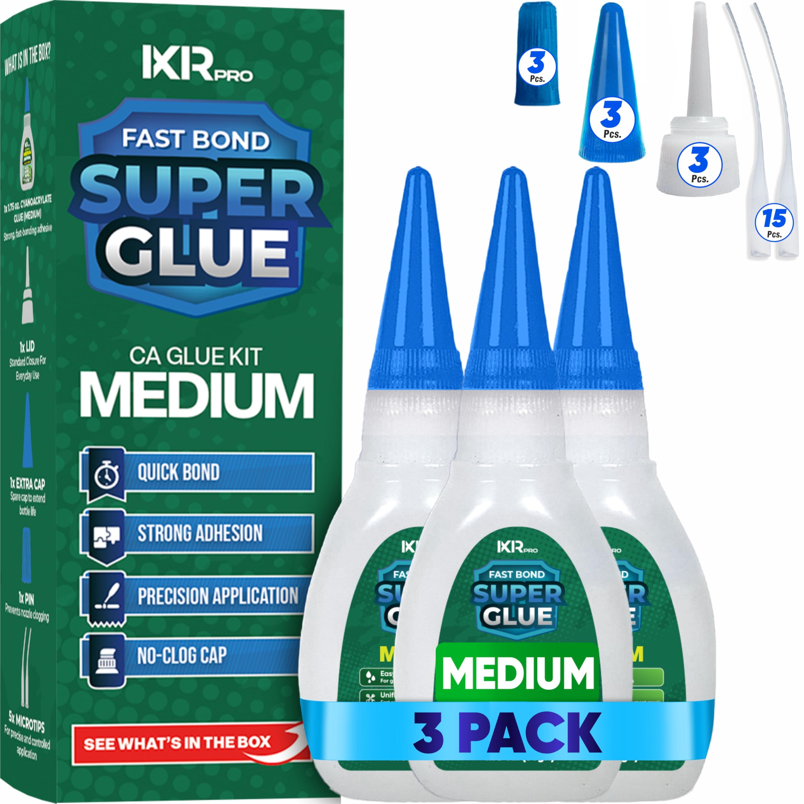 Package Contents: 3x1.75 oz. Cyanoacrylate Glue (Thin, Medium, Thick), 16.9 oz. CA Glue Accelerator, 15 Microtips, 3 Pins, 3 Lids. Ultimate Super Glue: Regardless of the nature of your project, Ixirpro CA Glue with accelerator spray will assist you in achieving a tidy and polished outcome. This super glue is ideal for both personal and industrial tasks, providing the necessary bonding! 3 Viscosities to Meet All Your Needs: Fine CA glue with activator works well for finishing, reinforcement of soft porous materials and perforation of microcracks. Medium CA glue with activator is ideal for bonding, fast bonding and repairs involving tight joints. Thick CA glue with activator is used in bonding situations where parts need to be positioned more slowly in order to fit into place before the glue hardens. viscosities are similar to those of motor oil, honey and water respectively. Easy Bonding: Your projects will be so much easier with this easy-to-use instant glue! Simply apply two to three drops of CA glue per square inch to one surface, mist the other surfave with CA glue accelerator spray. That is it, no more waiting, just in seconds. Cure times without the CA glue accelerator spray can reach up to two minutes. Compatible With Almost All Materials: You can use this cyanoacrylate glue and accelerator on a range of applications, including wood, metal, glass, leather, marble, rubber, ceramic, hobby models, rapid house repairs, woodturning, crack repairs and 3D-printed polycarbonate models and PLA, ABS, PETG. Products made of polyethylene and nonstick surfaces should not be exposed to cyanoacrylate adhesive.