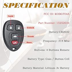HIGH-QUALITY: Every Single Keyless Entry Remote Control Car Key Fob is Fully Pre-tested by Professional Locksmith Tools before Shipping. All Our Key Fobs are Pre-installed with Battery and Electronics. COMPATIBILITY: Compatible with FCC ID KOBGT04A. Please Check Our Product Description and Vehicle Fitment Tool for Full Compatible Vehicles List. This Remote Key Fob Replacement Is Compatible with Chevy Malibu 2005-2012 Chevy Cobalt 2005-2010 HHR 2008 – 2011 Pontiac G5 2007-2009 Pontiac G6 2006-2010 Pontiac Grand Prix 2005-2008 Pontiac Solstice 2007-2009 Buick LaCrosse 2005-2009 Saturn Aura 2007-2009 Saturn Sky 2007-2010. REPLACEMENT: This Keyless Entry Remote Control Car Key Fob Replacement Is Compatible with Part Numbers: 15252034 PROGRAMMING: Self-Programming is not available. And it requires qualified locksmiths or dealership to program it. PACKING LIST: 2X Keyless Entry Remote Start Control Key Fob with Electronics and Battery Pre-Installed. Ready to Program.