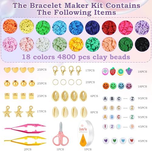 - [Bracelet Making Kit]: Everything you need for creating beautiful bracelets and jewelry is included in this friendship bracelet kit - from 4600 flat polymer clay beads and 500 charms( contains 6 complete sets letter beads of A-Z and 48 lesson vowels, spacer beads, clay beads charms, lobster clasp, etc.), stretchy strings, scissors, tweezers, and more. Let your imagination run wild with this expansive clay bead bracelet kit that caters to all your bracelet making needs.