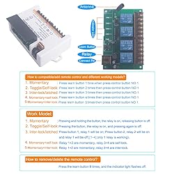 🍁【Wide Work Voltage】DC 5V-30V 12V 24V ,Low volt Control High Volt Switch 【Relay Load】10A 1V-250V(DC/AC),/10A 250V AC , 10A 125V AC, 10A 30V DC, 10A 28V DC, 10A 12V,Wide Voltage load. The switch relay can use DC 5V-30V to control 1V~250V(AC/DC). 🍁【Multiple Working mode】1. Momentary. 2 Self-lock/ Toggle. 3 Inter-lock/Latched. 4 Momentary+Selflock. 5 Momentary+ inter-lock; The work node can be adjusted by the learn button, depending on your needs. The 4 relays work that are independently or in combination. 🍁Simplified circuit routing, Multi-function wiring】Each relay works independently, and each receiver and each transmitter can be multiple to be compatible. the relay of 3 terminals(normally open, common, normally closed) can be modified for multi-purpose circuits. So it can simplify circuit remote control and save wiring cost. 🍁【Security&Stability&penetrate RF signal】The switch adopts 433Mhz RF tech, RF Encrypted remote control; No one can control the wireless switch without your permission;Strong stable signal that can pass through walls,&doors & obstacles, the remote distance is within 50 meters without obstacles. 🍁【 wide applications range】The remote switches are used in industrial homes, farms, factories, offices, laboratories, supermarkets fields etc. Other applications, such as wireless monitoring equipment, Power switch, small motor, buzzer, electromagnets, light, electronic power supply equipment,, Motors, Fans, Cameras, Video signals, Audio signals, electrically operated Doors/ Locks/ Windows, ventilation devices, signal transmission.