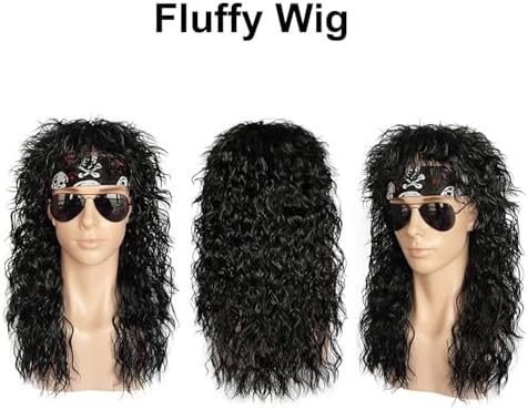 7 Pcs Rocker Men's Wigs Black Curls Disco Party Costume with Wigs, Sunglasses, Beards, Sleeves, Gloves, Headscarves for 70s 80s 90s, Medium