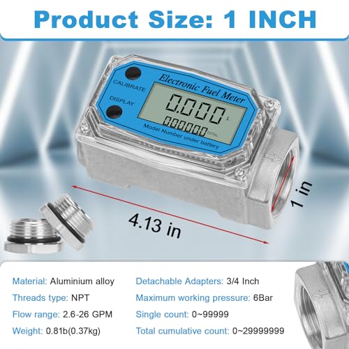 1" 2.6-26 GPM Inline NPT Thread Flowmeter, Digital Turbine Fuel Flow Meter, for Water, Diesel, Gas Oil, Gasoline, and Other Liquids - Supports Gallon, QTS, PTS, L, m³ with 3/4 in Adapters