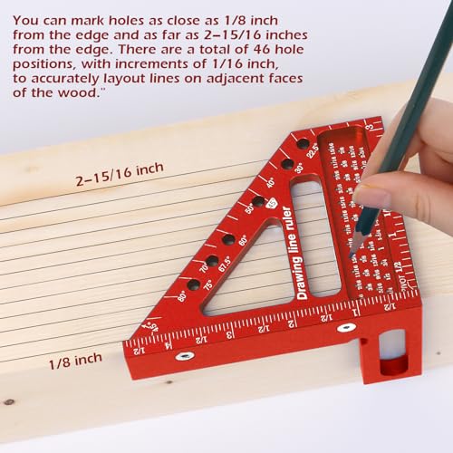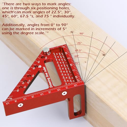 - Accurate Angles & Easy Measurement:Aiwons woodworking square ruler includes a 1/16 inch diameter marking hole and 5 degree increment angle line , 6 hole design, with positioning pin, easy to quickly mark 22.5/30/45/60/67.5/75/90 these common angles