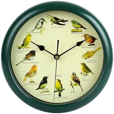 Description: - 【Outdoor Birds Theme】Wall Clock features the image of the twelve wild birds, for the outdoor enthusiast - 【Premium Material】Singing Bird Wall Clock is made of pp frame, glass cover, with green color finish - 【Size Information】Singing Bird Wall Clock measures apporox 25cm/9.84inch in diameter - 【Feature】 Wall clock is battery operated (but not included), you can hear the distinct call of a different bird every hour (Bird singing starts at 6am and ends at 9pm, stopped from 10pm to 5am) - 【Easy to Install】Musical Birds Wall Clock including large keyhole on back of clock for easy hangingSize Chart:25cm/9.84inch in diameterPackage Includes:1 Singing Bird Wall ClockNote:Please allow slightly errors due to manual measurement and different monitors.