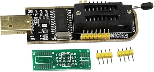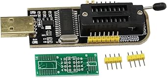 - Features: 1.Nowadays, EEPROM chips in many motherboards, routers, set-top boxes, LCD screens, game consoles, etc. use SOP8. 2. Rather than the traditional process of removing the chip and rewriting, you can use this clip to directly hold the chip and rewrite. 3.Please note: Depending on the circuitry around the chip, it may not be possible to insert the chip directly. Please check the location of the chip on your motherboard before purchasing. 4. It prevents damage to the chip and is very efficient. 5.This test clip can be used by connecting with many high power programmers. 6. When connected with a programmer with protection function, it cannot be read at normal voltage. You need to add 3.3V voltage. 7.How to use: While holding the chip, add 3.3V to the pin that hits the 8th pin of the chip. 8. There are two wires for the 3.3V power supply, VCC should be connected to the clip and the other should be connected to ground. 9. Do not force down when pinching to avoid breaking the tip of the clip. Open the clip and pinch it from both sides of the chip. 10.And when removing it, do not pull it out directly. Separate the left and right sides of the clip and then remove them. CH341A programmer features: Download support for single-chip series procedures. Equipped with CH341A chip that can recognize 25 series chips. The lamp indicates the 24/25 status. Supports utility expansion via SPI pins. Support 24 EEPROM and 25 SPI flash 8pin or 16pin chips. Package include: 2 X CH341A USB programmer; 2 X 8Pin to 8Pin converter; 2 X SOP8 SOIC8 test clip; 4 X 2.54mm 4-pin header; 4 x SOP8 SOP16 to 8Pin converter