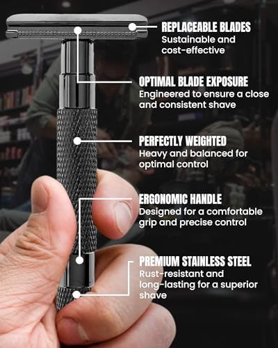 • HEAVY-DUTY CONSTRUCTION - Crafted from heavy-duty stainless steel, this safety razor men ensures dependable performance. The safety razor handle provides balance and control, making it an essential addition to your safety razor kit.