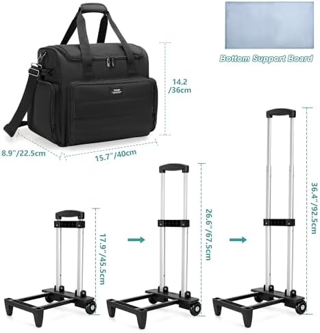 - [Premium Quality] Made of heavy-duty nylon material. Well-padded design and bottom support board keeps bag in shape and provide great protection. U-shaped large opening design with smooth two-way zipper for easy access. The fixing strap with side release buckle on the lid can fix the lid to the aluminum telescoping handle and keep it open, making it smoother to put in and take out items.