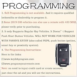 - Note: Some 2019 GM vehicles can also use a remote with 433 MHZ, please verify prior to purchasing. This is Aftermarket Remote Key Fob/Non-OEM, and It Doesn’t Come with LOGO or Badge. Important Note: It only Supports Regular Key Vehicles. It Doesn’t Support Push Start Button Vehicles. WILL NOT WORK FOR VEHICLES WITH PASSIVE ENTRY (also called PEPS, push button ignition, smart key or proximity system) Compatible with Chevrolet/Chevy Models: Colorado 2015 2016 2017 2018 2019 2020 2021 Silverado 2014 2015 2016 2017 2018 2019 2020 Suburban 2014 2015 2016 2017 2018 2019 Tahoe 2014 2015 2016 2017 2018 2019 Compatible with GMC Models: Canyon 2015 2016 2017 2018 2019 2020 Sierra 2014 2015 2016 2017 2018 2019 Yukon 2014 2015 2016 2017 2018 2019 Replacement for: FCC ID: M3N-32337100 Part Numbers: 13577771 22859399 PROGRAMMING: Self-Programming is not available. And it requires qualified locksmiths or dealership to program it. Frequency: 315 Mhz Battery: CR2032