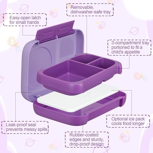 Bento Box for Kids,Kids Bento Lunch Box with Built-in Ice Pack for School,3 Compartments Leak Proof Lunch Container with Utensils for Girl Boy;BPA Free,Microwave & Dishwasher Safe, 44oz(Purple)