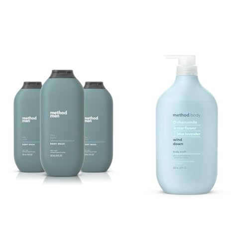 This bundle contains Method's plant-based and biodegradable body washes to leave you feeling refreshed. The first component is a pack of 3, 18 FL Oz bottles of Method Men's body wash in the Sea + Surf scent. It features a quick-lathering formula made without parabens or phthalates, with a crisp, clean fragrance inspired by seaside adventures. The second component is a 28 FL Oz bottle of Method's Wind Down body wash for women. Infused with relaxing chamomile, starflower, and blue lavender, it leaves skin soft with a scent like bedtime bliss. Both body washes use cruelty-free formulas and bottles made with recycled plastic - 65% PCR plastic for the Method Men's and 80% PCR plastic for the Wind Down. With plant-based cleansers and nature-inspired fragrances, this bundle offers complementary body washes for both men and women seeking a refreshing, sustainable cleaning routine.