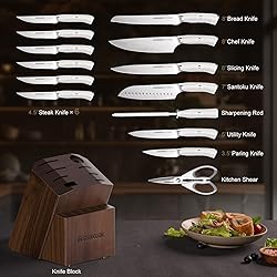 【Multipurpose Kitchen Knife Set】 8" chef knife, 8" slicing knife, 7" santoku knife, 8" serrated bread knife, 5" utility knife, 3.5" paring knife, 6pcs 4.5" serrated steak knife, kitchen shears, knife sharpener,and hard wood knife block. 【Excellent Process Technology】 Made entirely of high carbon stainless steel, this set of kitchen knives is held in place by rivet for durability. The ergonomically designed ABS handles provide a comfortable grip and the handles will never loosen or fall off. 【Premium Knife Sets For Kitchen With Block】 Ultra sharp, full tang, rust resistant technology, German 1.4116 stainless steel. Outstanding craftsmanship, cutting edge technology, stunning design, and superior materials. This is the best choice for professional kitchen or home use. 【Perfect Holiday Gift】 Perfect for those who love the kitchen or new cooks who are just learning to cook and can satisfy all cooking needs! It's a great holiday gift for mother, daughter, wife and girlfriend! 【Astercook Lifetime Warranty System】Astercook each set of knives based on excellent quality, after strict quality inspection, superior customer service for each customer to provide a lifetime warranty, please feel free to buy!