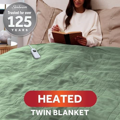Sunbeam Royal Ultra Fleece Electric Heated Blanket wraps you in cozy, comforting warmth on chilly nights. Made from soft royal ultra fleece, this 84" x 62" Twin size electric heated blanket adds comfort and style to your bedroom. The Sage Green color—a soft, matcha-inspired green—brings a fresh, calming accent to your space and complements a variety of bedroom décor styles. It features a digital controller with 12 personalized heat settings, allowing you to customize your ideal level of warmth. The LED display dims automatically after 10 seconds to minimize bedroom light, and the controller remembers your last setting for added convenience. For safety and peace of mind, it includes a 12-hour selectable auto shut-off. Premium heated wires deliver consistent, even warmth across the entire surface. When it’s time to clean, simply detach the controller and toss the blanket in the washing machine. It’s dryer-safe and stays soft after every wash. Sunbeam heated blanket—experience the gift of warmth and a whole new level of cozy. Perfect for yourself or to share with friends and family. Trusted for over 125 years.