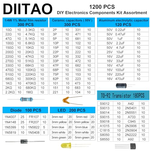 1200PCS Basic Electronics Component Assortment Kit Basic Electronics Component Kit,Ceramic Capacitor,Aluminum Electrolytic Capacitor,Transistor,LED Diode,Common Diodes,Resistors for Arduino