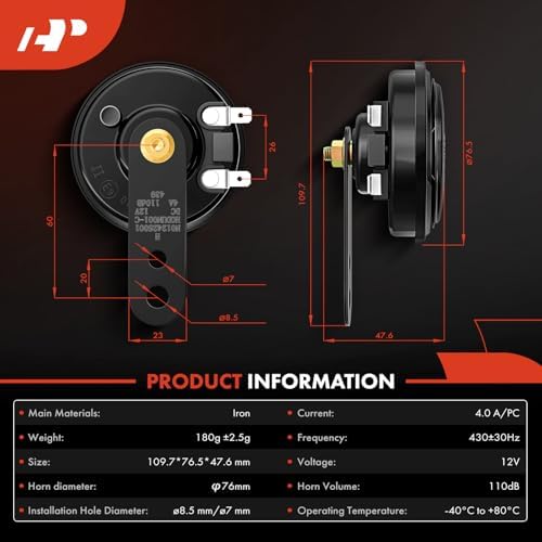 - [Specifications]: ①Color: Black; ②Material: Metal; ③Diameter: 76 mm; ④Voltage: 12 V; ⑤Current: ≤4.5 A/PC; ⑥Horn Volume: 110 dB; ⑦Frequency (High): 430 Hz
