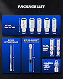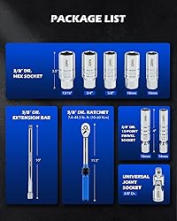 Effortless Spark Plug Handling: Orion Motor Tech's 3/8" drive spark plug socket set is designed for easy removal of spark plugs from modern engines. It includes a 7.4-44.3 lb.-ft. ratchet, 2 swivel sockets, 5 hex sockets, a universal joint socket, and a 10" extension bar Precision Ratchet with Alert: This 72-tooth ratchet's 5° swing arc allows for precise control and effortless operation, even in tight spaces. Its click-sound alert ensures accurate force application, preventing overtorque and ensuring project safety Easy Access & Removal: The 12-point magnetic spark plug socket feature a 360° swivel design, ensuring easy access to the spark plug even in tight places, while the hex sockets with 6-point openings provide maximum torque for effortlessly removing stubborn fasteners Simple Socket Organization: Each spark plug socket is clearly marked with its size for easy identification during use. The blow-molded storage case ensures quick and easy organization and transport between jobs Heavy-Duty Construction: Crafted from sturdy Cr-V steel with heat treatment, this spark plug torque wrench offers exceptional strength and even force distribution, ensuring reliable performance and long-lasting durability Note: Only 12-point sockets include magnets; all other sockets do not.
