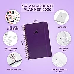 DATED PAGES, SPIRAL BINDING & LAMINATED TABS - This dated planner for 2026 lasts 13 months (Jan 2026-Jan 2027). It measures 6.3 by 8.4 inches with eco-leather hardcover, thick 120gsm paper, elastic band, spiral binding, and laminated monthly tabs. SET & ACHIEVE LIFE GOALS STRATEGICALLY – This goal setting planner 2026 will help you create a vision for your life, define your life goals, and incorporate them into your monthly, weekly, and daily agendas. MANAGE YOUR TIME EASILY WITH ADVANCED PLANNING TOOLS - Inside this 2026 weekly planner notebook, you will find everything you need to stay organized, including weekly and monthly pages, habit tracker, to-do lists, progress reviews, and more. USER MANUAL, STICKERS & GIFT BOX INCLUDED - This weekly planner 2026 comes with a detailed user guide, 3 sheets of colorful planning stickers, and a keepsake gift box. 60-DAY MONEY-BACK GUARANTEE - We will exchange or refund your weekly planner for 2026-2027 if you aren’t satisfied with your work planner for 2026-2027 for any reason. Reach out to us via message to refund your 2026-2027 weekly planner.