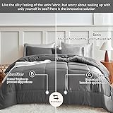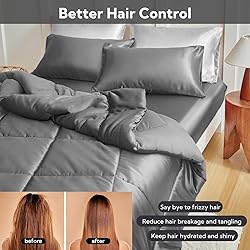 Innovative Reversible Design: Experience the luxury of satin without slipping! The side touching your skin is made of ultra-soft microfiber for a comfortable, non-slip sleep experience, while the reverse features glossy satin for an elegant look. Transform your bedroom with our reversible comforter! Improve Your Beauty Sleep: Silky soft satin pillowcases reduce friction, preventing hair breakage and frizz for healthier, shinier hair. Gentle on the skin, it minimizes sleep lines and wrinkles, making it ideal for beauty-conscious sleepers. Upgraded Filling for Comfort: Switched to a softer, lighter, and more elastic 300 GSM premium filling, making it perfect for year-round use. The comforter gently wraps around your body, soothes your skin, relieves fatigue, and creates a peaceful sleep environment. Machine Washable: This soft bedding comforter set is easy to care for with box quilting that prevents the filling from shifting or clumping, ensuring durability. Wash separately in cold water on a gentle cycle, then tumble dry on low or air dry, and iron on low if needed. What's Included: This queen size comforter set includes 1 reversible comforter (90" x 90") and 2 satin pillowcases (20" x 26"). Since the comforter is vacuum-sealed, please unfold and let it sit for 6-8 hours after opening to regain its fluffiness.