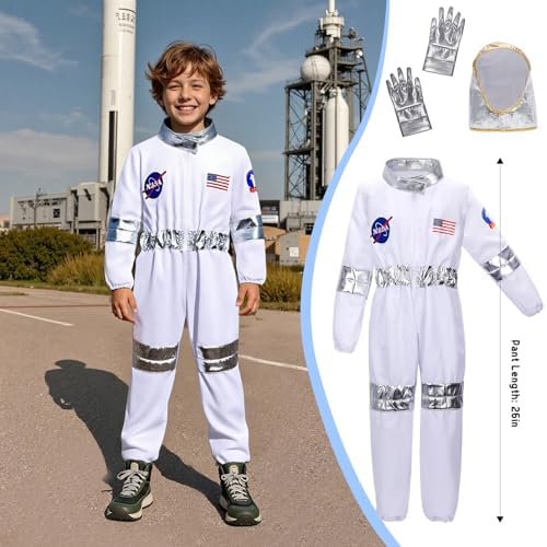 - El disfraz de astronauta LOYO para niños será el disfraz perfecto para los niños curiosos que están fascinados por el espacio y curiosos sobre lo que hay ahí fuera. El traje del disfraz de astronauta para niños es un mono con cremallera con detalles plateados y bolsillo de plástico, completo con guantes plateados, tocado y etiqueta de nombre, el material es transpirable y lo suficientemente cómodo para que sus niños lo usen. El tocado es una parte separada, que se mantiene de forma segura debido a los velcros alrededor de la barbilla.
