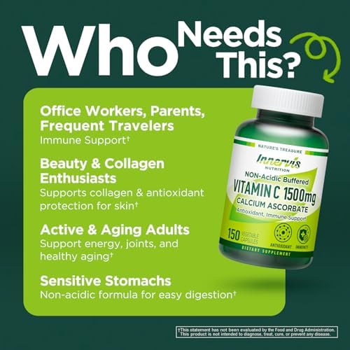 Gentle Non-Acidic Vitamin C 1500mg – High-Absorption Calcium Ascorbate for Immune & Antioxidant Support – 150 Veggie Capsules
