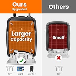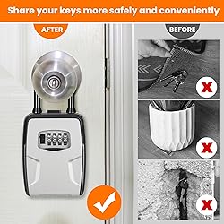 STURDY AND DURABLE: Fayleeko key lock box is made of high strength zinc alloy and heavy-duty stainless-steel material, well-made and sturdy enough to withstand hammering, resist crushing, sawing, and prying. And the ABS shell can effectively prevent rain, dust, Snow, sun protection, and repeated use for a long time UPGRADE LARGE CAPACITY: The portable key security gym locker box provides large internal space for holding up to 6 house keys [shorter than 3.35 inches]; When you're traveling or out for business, you can put your house keys, car keys, or access cards in; EASY TO INSTALL AND USE: There are 2 mounting options for this combination lockbox for keys. You can mount it on the wall with supplied plugs and screws; besides, you can hang it anywhere easily including doorknob, metal fence, railing, and pipe, no tools needed; SAFE FOR KEYS: This key lock box with a 4-digit code that allows you to set your own combo code with 10000 unique choices, which ensure security and your keys safe. It is tightly sealed and waterproof, durable enough for the house key and outside key storage; WIDELY RANGE OF APPLICATION: By using this 4-digit key lock box that allows you or others access the key at any time, which perfectly suitable for daily activities, friends, relatives, home services, emergency entry, pet sitters and real estate business, etc;