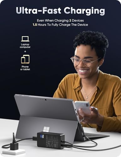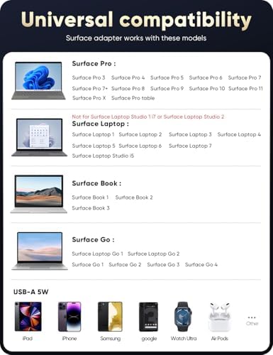- Broad Compatibility:Our charger is designed to work seamlessly with a wide range of Microsoft Surface devices, including Surface Pro 11, 10, 9, 8, 7+, 7, 6, 5, 4, 3, X, Surface Studio 1 i5, Windows Surface Laptop 6, 5, 4, 3, 2, 1, Surface Book 3, 2, 1, and Surface Go 3, 2, 1.